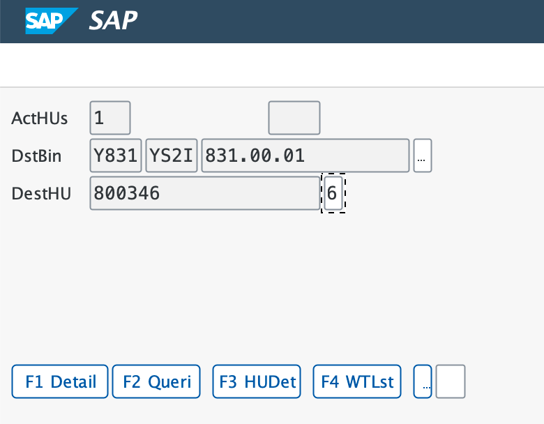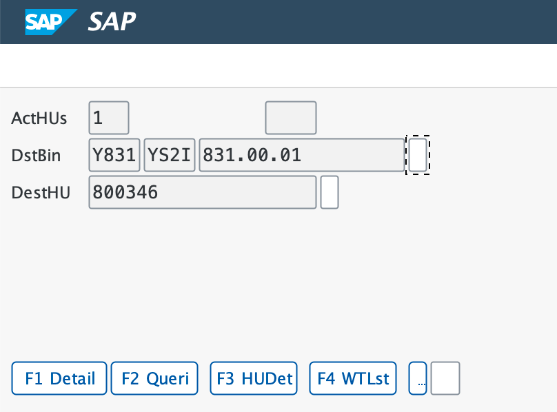 On the next screen, confirm the task to the destination bin by scanning Destination bin and Destination HU.